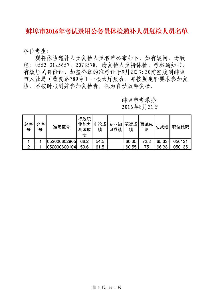 蚌埠市2016年考试录用公务员体检递补人员复检结果