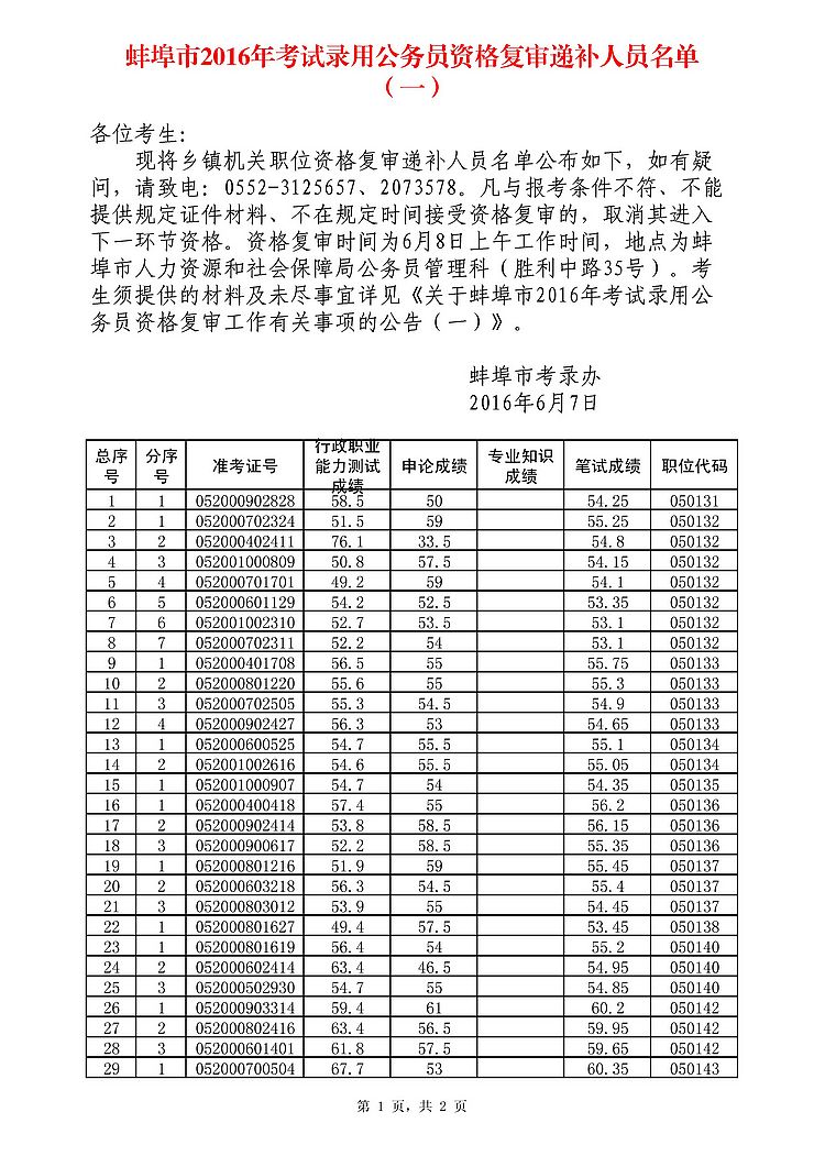 蚌埠市2016年考试录用公务员资格复审递补人员名单(一)