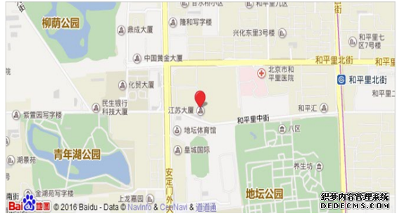 北京江苏大厦7号楼(酒店楼),具体地址:北京市东城区安定门外大街丁88号,总机电话:010-64271188。乘车路线:(1)乘坐地铁5号线到“和平里北街”站下车西南口出,沿和平里西街右转进入和平里中街,沿和平里中街走720米,右前方到达。(2)公交线路:乘坐104路、108路、特11路公交车至“地坛西门”站下车,向北行走50米可到达。